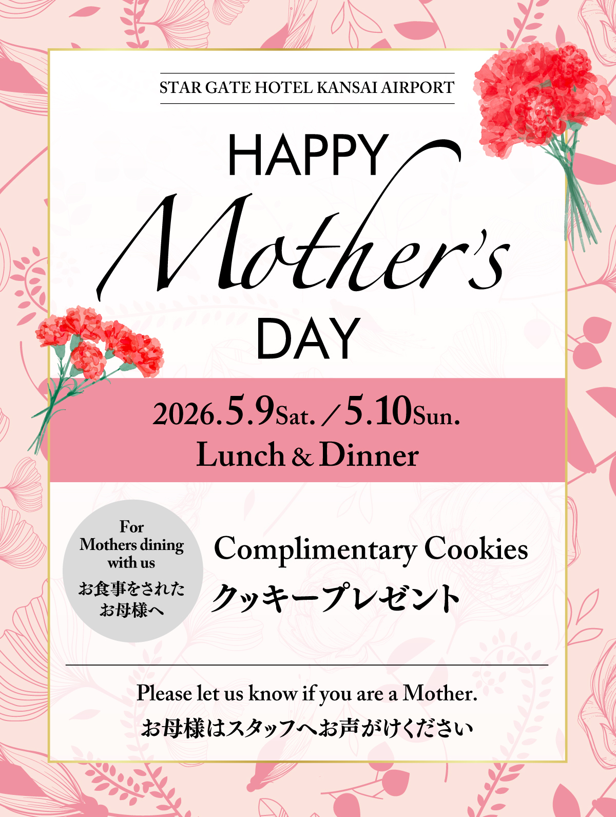 HOME 新着情報 NEWS & TOPICS新着情報 2026.04.21 restaurant 【5/9、5/10】母の日キャンペーン 対象店舗 54F スカイダイニング256「スターゲイト」※朝食除く 53F 中国料理「星龍」 52F 鉄板焼「りんくう」 52F 日本料理「天翠」 52F しゃぶしゃぶ「天空」 CATEGORYカテゴリー NEWS & TOPICS新着情報 一覧 ACCOMMODATION宿泊 HOTELホテル RESTAURANTレストラン BANQUET / MEETING宴会・会議 LATEST NEWS最新情報 【5/9、5/10】母の日キャンペーン レストラン営業時間のご案内 【GW限定/お子様割】蟹食べ放題ディナーバイキング付 宿泊プランのご案内 クイックBARプラン付宿泊プランのご案内 【水〜日曜日】夜景BAR