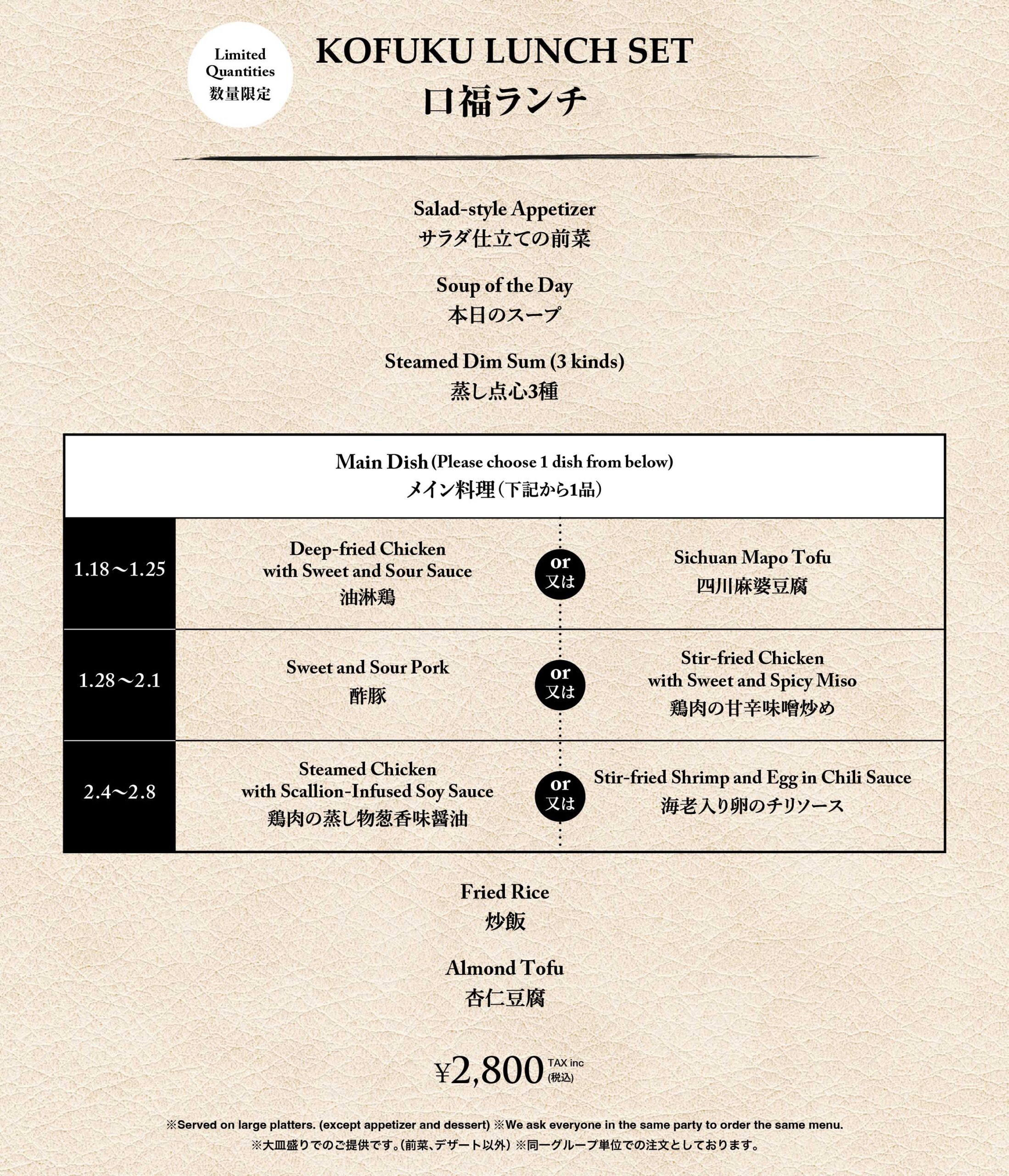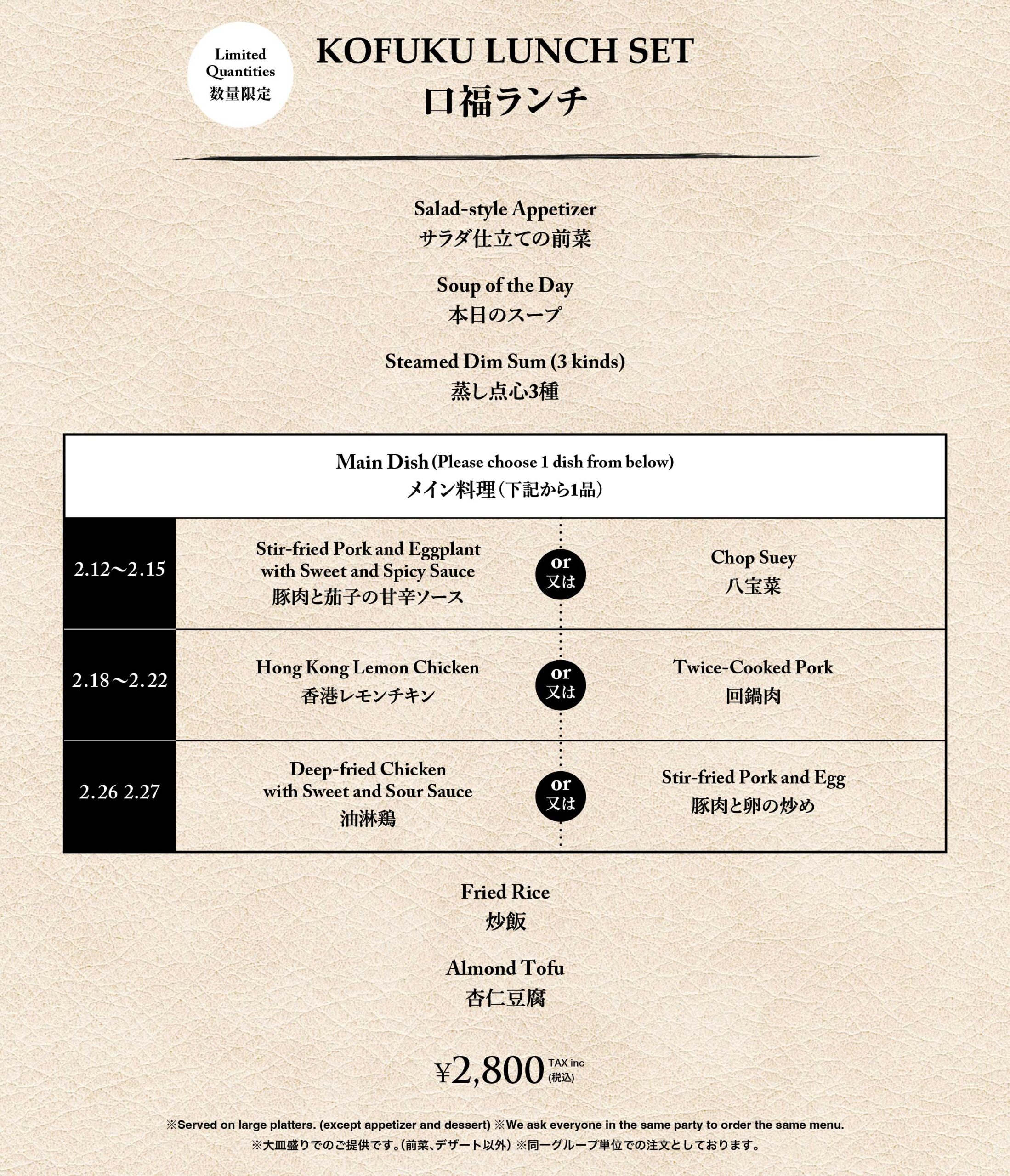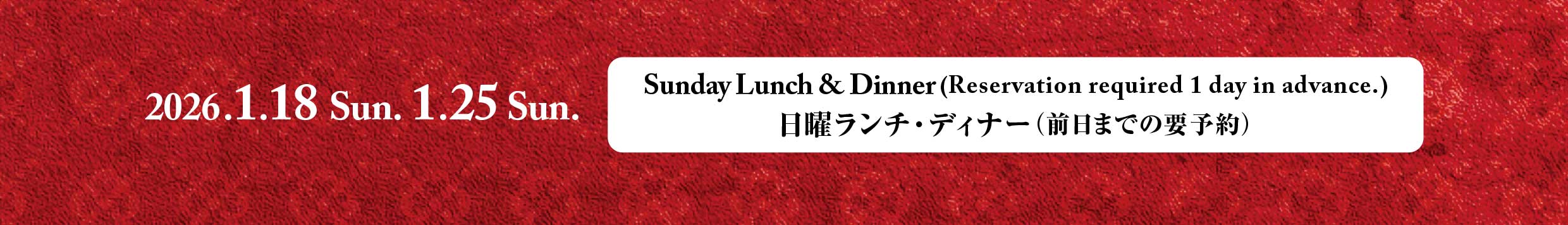 | 【臨時休業日】 ランチ:2月5、25日 ディナー:2月15、21、25日 ※ラストオーダーは終了の30分前 |