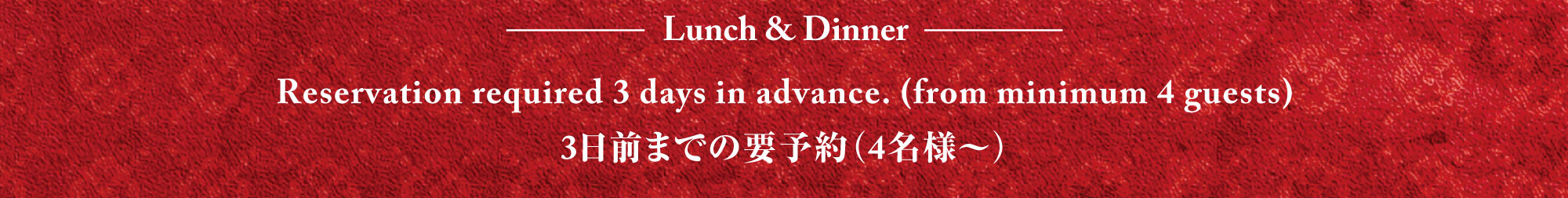 | 営業時間 | 【1月18日〜】営業日 ランチ:水〜金曜日、日曜日 ディナー:日曜日 ※祝日除く 【予約制】 ※3日前までの要予約(4名様〜) 1月ランチ:4、7〜12、15、16、21〜24、28〜31日 1月ディナー:4、7〜10、15、16、21〜24、28〜31日 2月ランチ:7、11、14、21、23、28日 2月ディナー:水〜土曜・祝日 ランチ :11:30〜14:30 平日ディナー :18:00~22:00 土日祝日ディナー:17:30~22:00 |